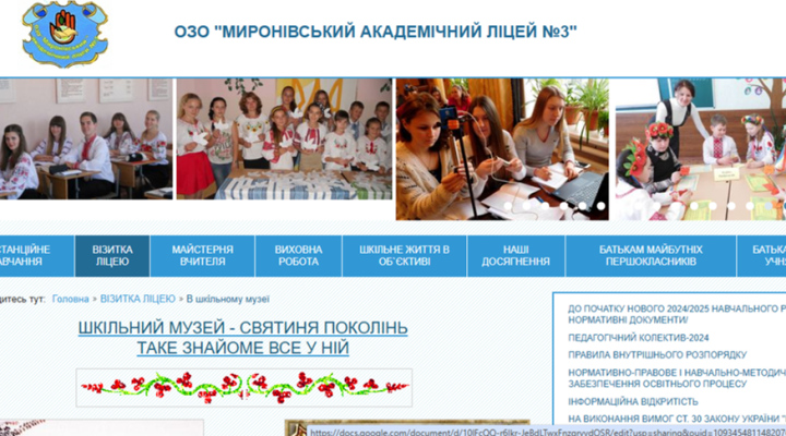 Музей відкритий 03 вересня 2012 р., його матеріали розповідають про історію ліцею від дня створення до сьогодення. Експонати містять відомості про заснування міста, започаткування освіти у селищі. А також розділи: історія школи у фотографіях, фото приміщень, випускників – перших учнів, відомості про педагогічний колектив, фото та фотоальбоми випускних класів різних років, починаючи із 1946 р., відомості про трудову діяльність та фото директорів школи. Тут представлена виставка підручників, книг та журналів; фото найкращих спортсменів – випускників, фото шкільного життя протягом багатьох років, а також зібрана колекція навчальних ТЗН (глобуси, амперметр, платівки, протигаз, циркуль, діафільми, старі бобіни для демонстрації навчальних фільмів, шаховий годинник. – Джерело: http://myronivka-school3.edukit.kiev.ua/informaciya_pro_zaklad/v_shkiljnomu_muzei/