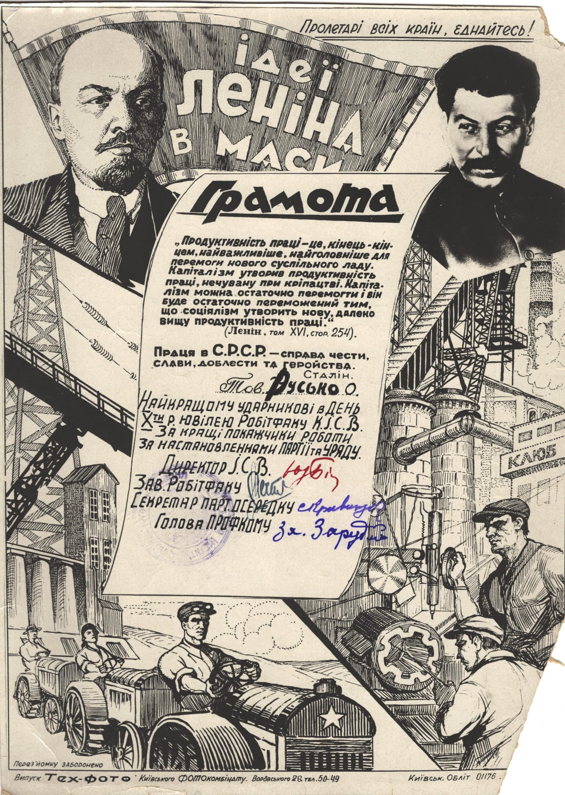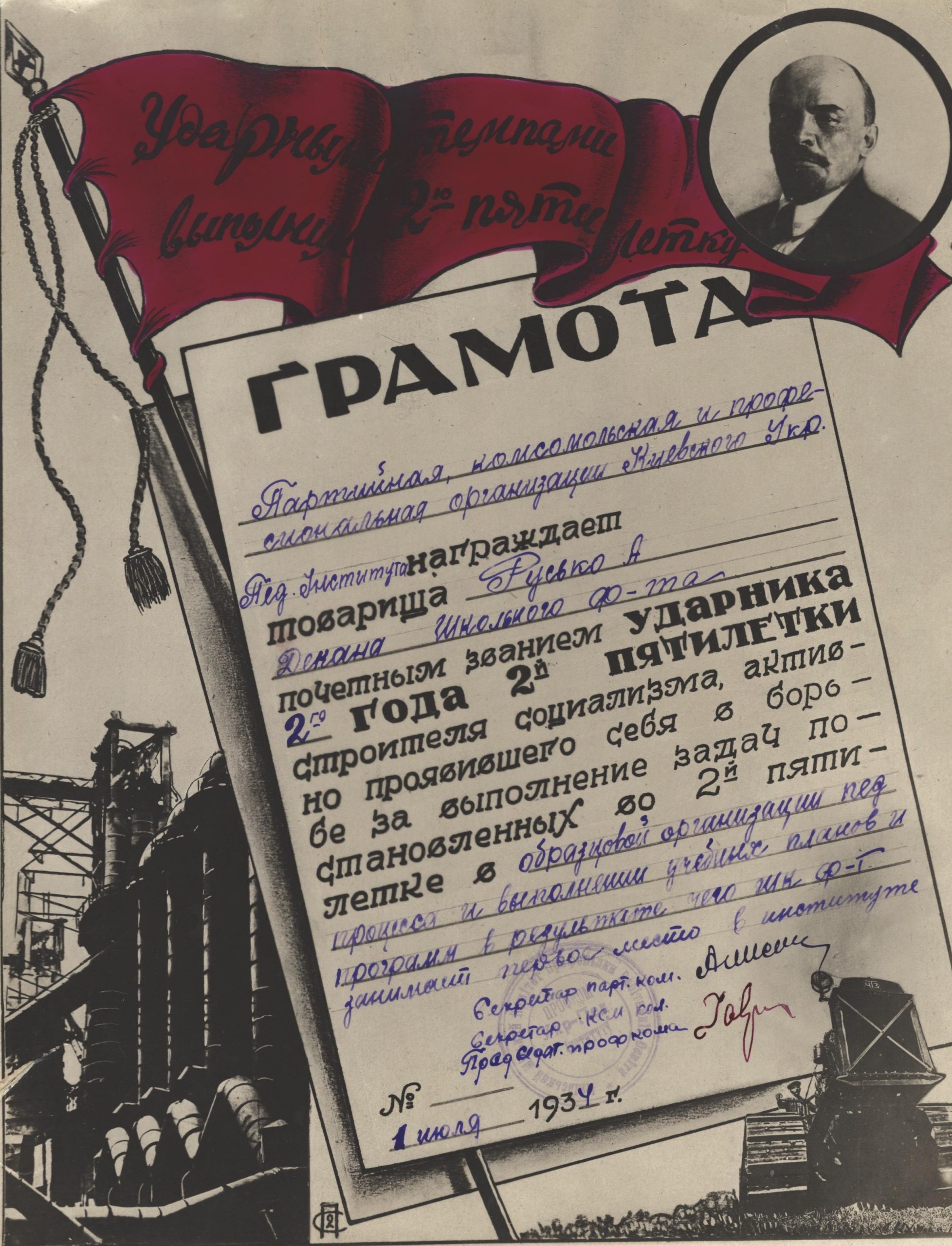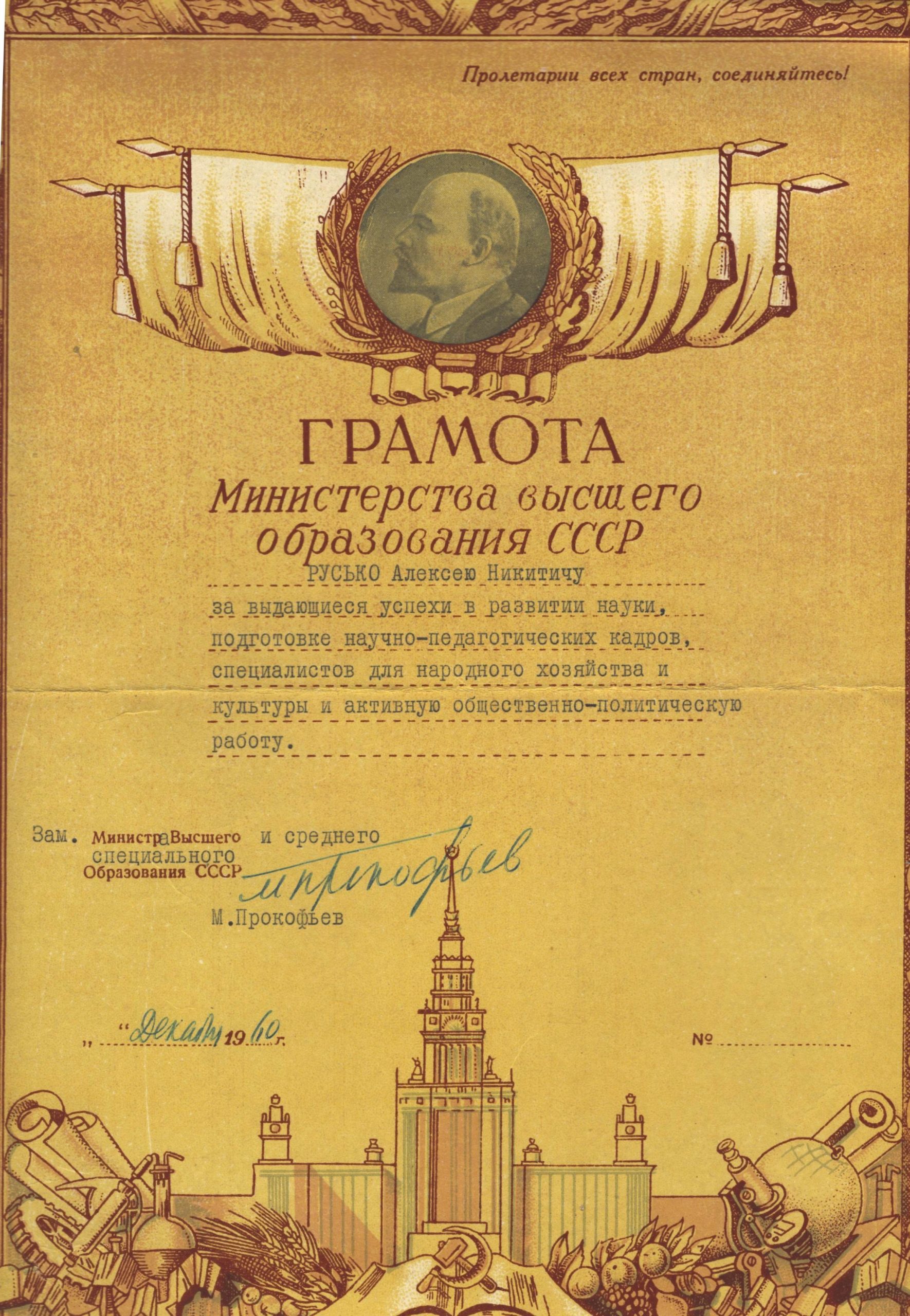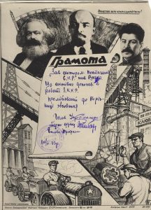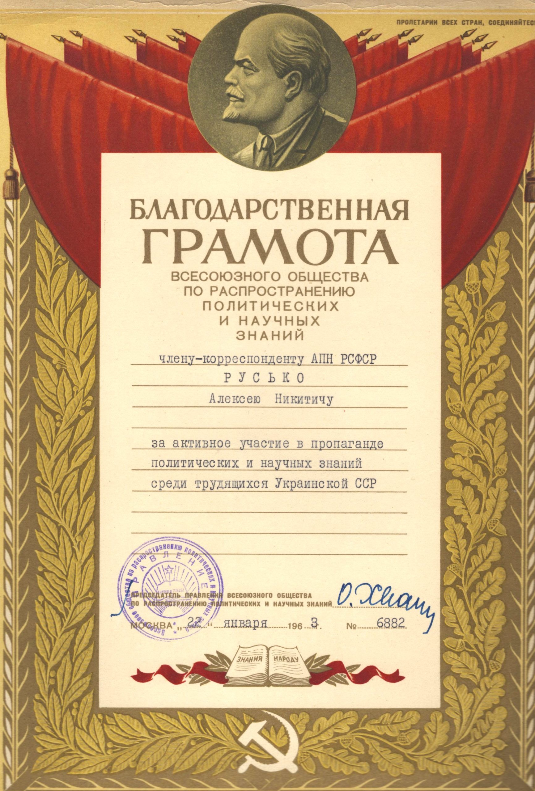 Грамоти Олексія Руська. Такими грамотами в радянський час відзначали навчальні, виробничі та громадські досягнення. Вони відображають не лише освітнє життя епохи, а й характерну систему символів, риторики та ідеологічних акцентів того часу.