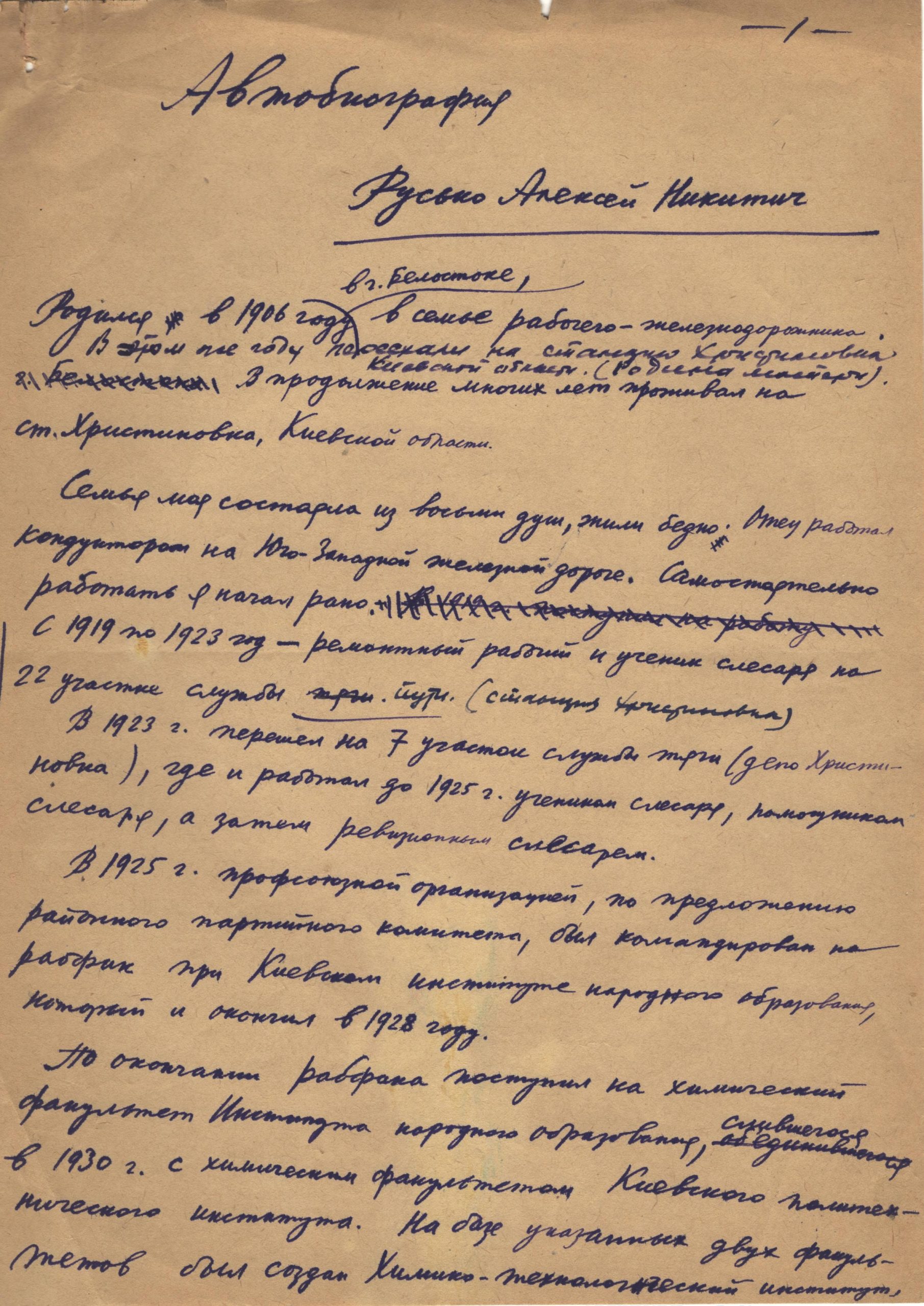 Народився Олексій Микитович Русько 30 березня 1906 р. в м. Білосток (Польща) у родині залізничника. У 1932 р. закінчив Київський хіміко-технологічний інститут і був запрошений працювати до Київського інституту соціального виховання. У 1932–38 рр. – на викладацькій і керівній роботі в Київському педагогічному інституті.