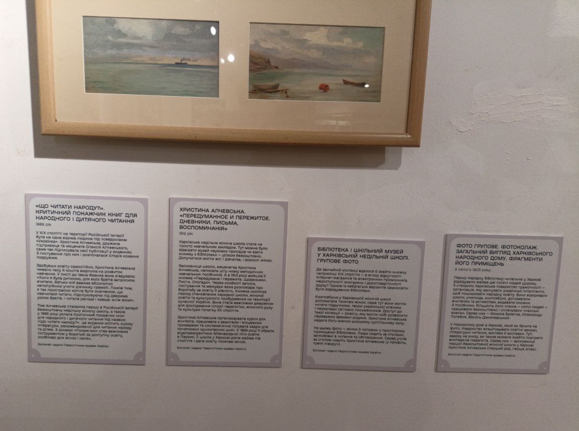 Педагогічний музей України надав для виставки десять експонатів, що яскраво ілюструють тему меценатської підтримки освіти та культури: книги та фото Христини Алчевської ( кін. ХІХ – поч. ХХ ст), що відображають її педагогічну діяльність та внесок у розвиток народної освіти, а також видання, підтримані Євгеном Чикаленком, серед яких: «Літературно-науковий вістник» (1903, 1906) та «Киевская старина» (томи за 1884, 1885, 1901).
