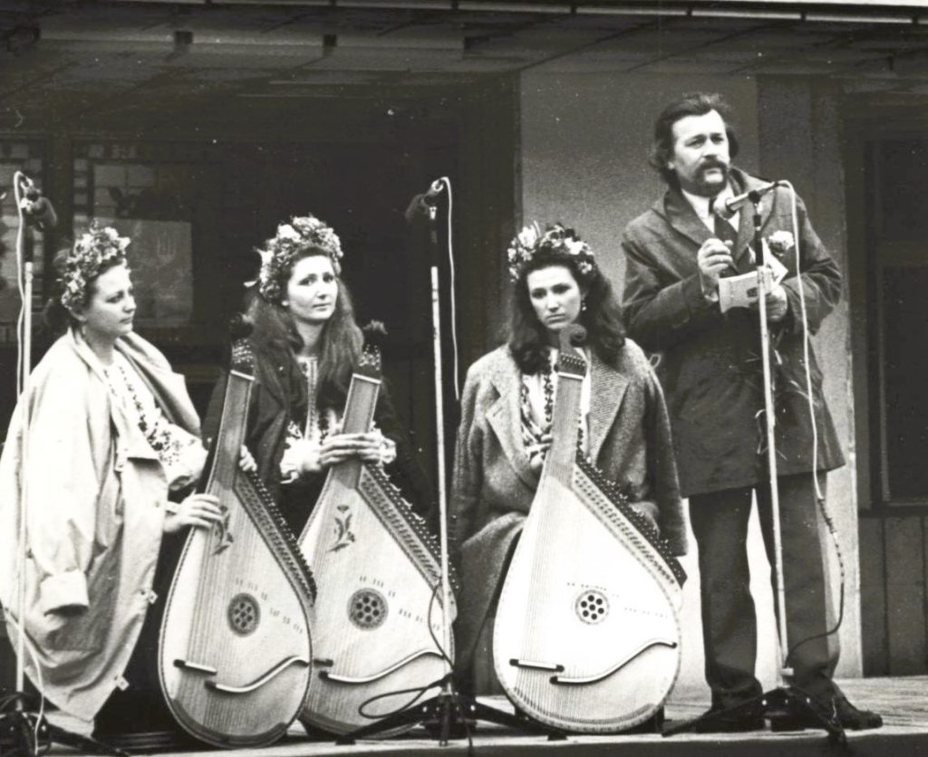 - Д. Чередниченко на фестивалі у Литві (Вільнюс, кін.1980-х рр.) Бандуристки на фото: Галина і Леся Тельнюк, Олена Козленко. Фото Жижюнаса Альгимантаса.